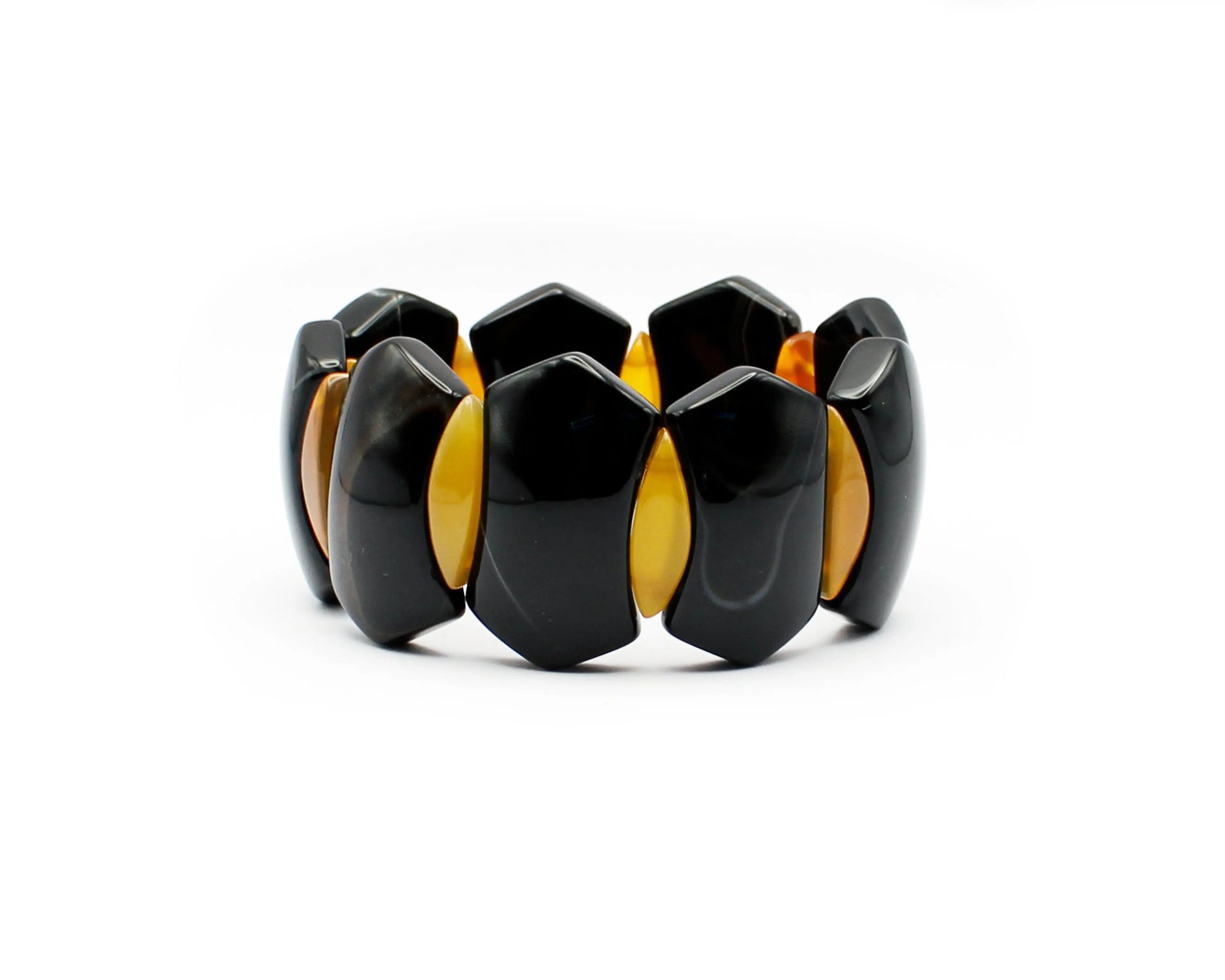 Dieser außergewöhnliche Armreif aus echtem Achat aus Brasilien verbindet moderne Formgebung mit natürlicher Ausdruckskraft. Die markanten Navette-Elemente (ca. 30 mm) zeigen ein harmonisches Farbspiel aus sattem Schwarz und warmen Honig- und Bernsteintönen – eine seltene Kombination, die sofort ins Auge fällt.