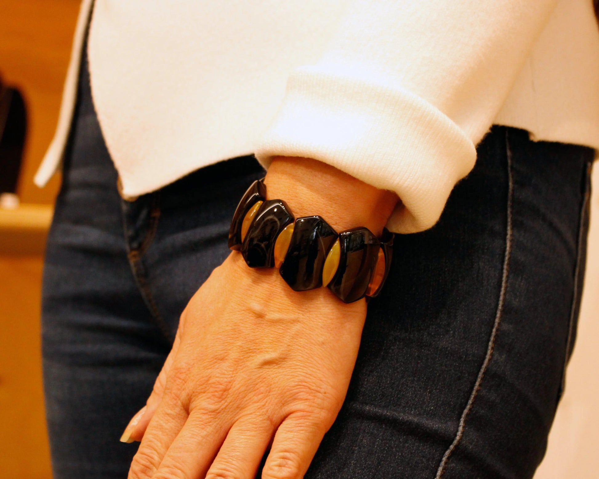 Jedes Element wird sorgfältig geschliffen, poliert und zu einem flexiblen Armreif verarbeitet. Die besondere Linienführung betont die elegante, fließende Form und macht den Armreif zu einem stilvollen Statement-Piece.