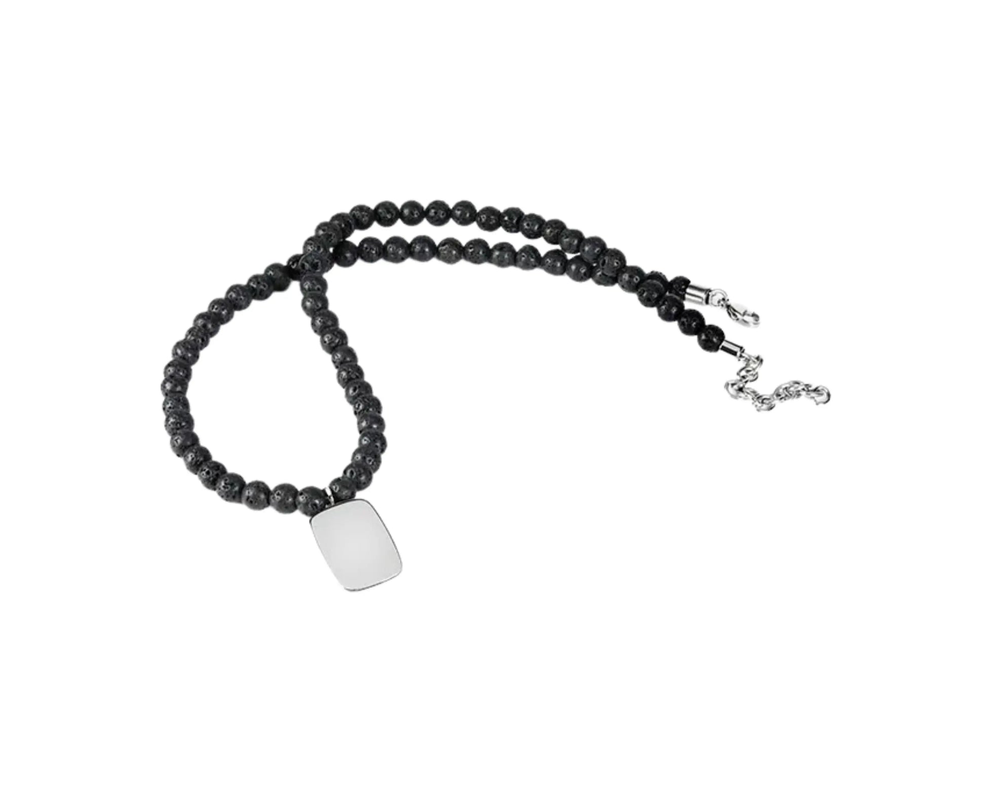Ce collier moderne associe la texture naturelle des pierres de lave à une élégante plaque gravée en acier inoxydable. Les pierres de lave, d'un diamètre d'environ 6,5 mm, confèrent au collier un aspect à la fois saisissant et naturel.